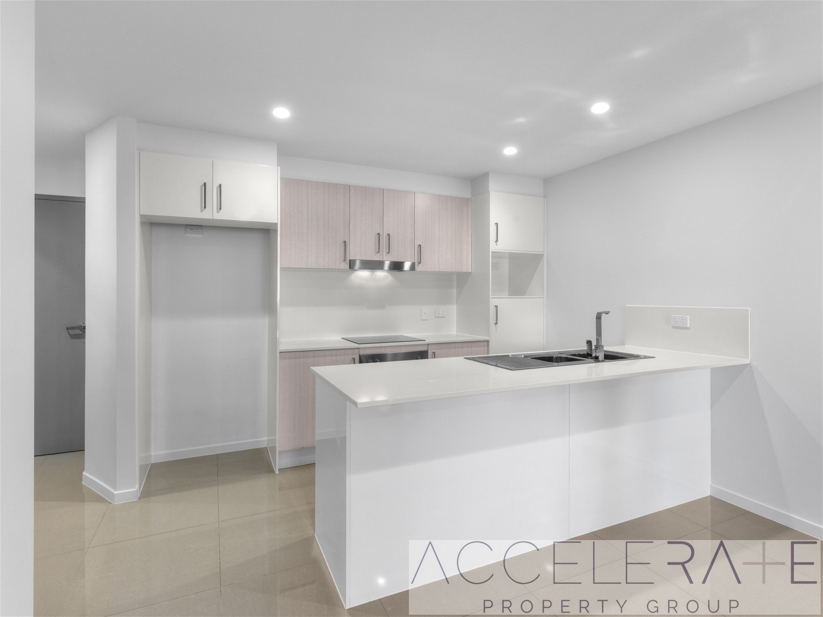 - Modern kitchen with cupboards to ceiling, stone benches and stainless steal European appliances