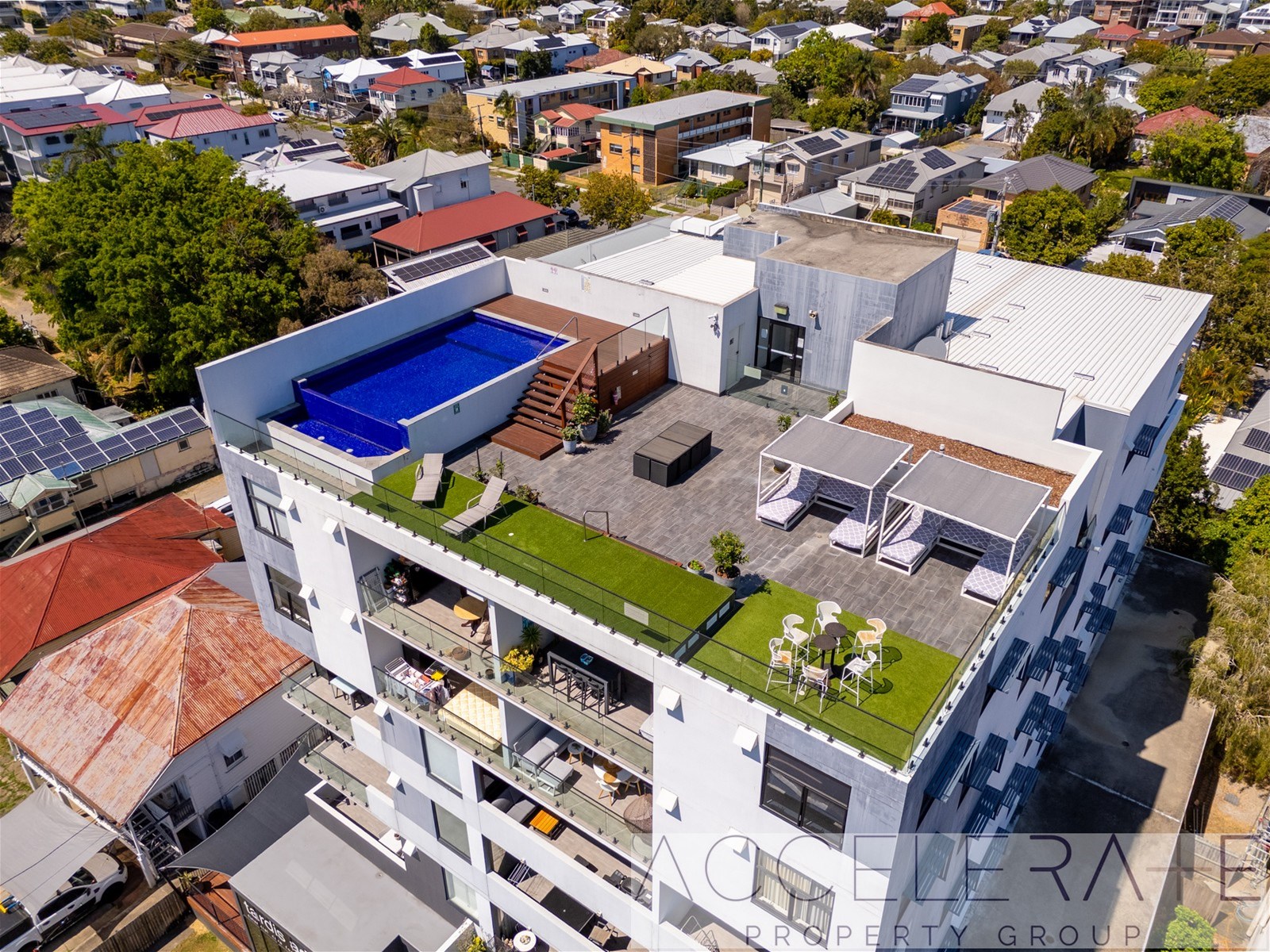 - Rooftop pool, entertaining area & elevator in the complex